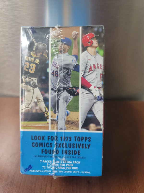 9 cards per pack, 8 packs per box(blaster exclusive extra pack). Look for Real One Autos and relics, and also 1973 Topps Comics inserts.